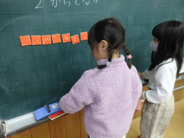 1年生の3時間目は算数の授業でした。「数を数えよう」の学習です。まずはバラバラに置かれたマグネットと10のまとまりを作って置かれたマグネットのどちらが数えやすいかを理由も合わせて考えました。「10のまとまりを作ると一目で数が分かる」ことを確認し、教科書の問題に取り組みました。近くの人と話し合ったり、分からない人にやり方や考え方を説明してあげたりする姿がたくさんありました。学級目標の「みんなで成長しよう」に向けて頑張っています。