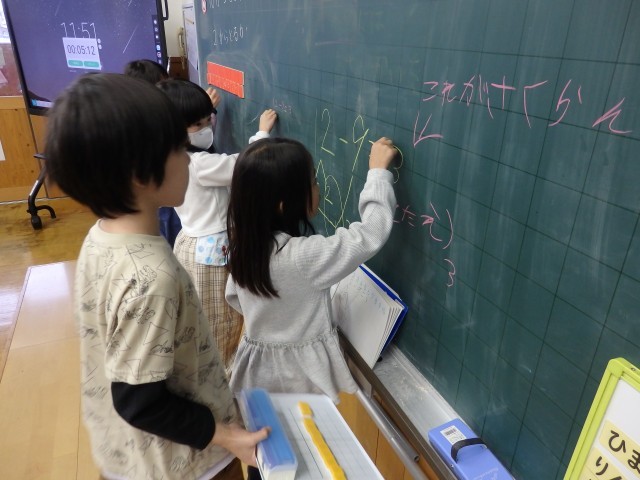 1年生の3時間目、算数のつづきです。12-9の計算の仕方を考えていますが、その途中で「先生にも教えてあげようか?」と担任の先生にやり方を説明している子がいました。やり方がわかった人は黒板に貼ってあるネームプレートを「分かったゾーン」に移動させて「分かった!」という意思表示をします。先生が言った「自分だけ分かったんじゃダメだよ。全員が分からなければダメ」ということばを受けて、まだ「分かったゾーン」に入っていない子に「教えようか?」と助けに行く子どもたちでした。図や足し算で学習したさくらんぼ算を使ったり、計算しやすいように10を作ったりした子がいました。