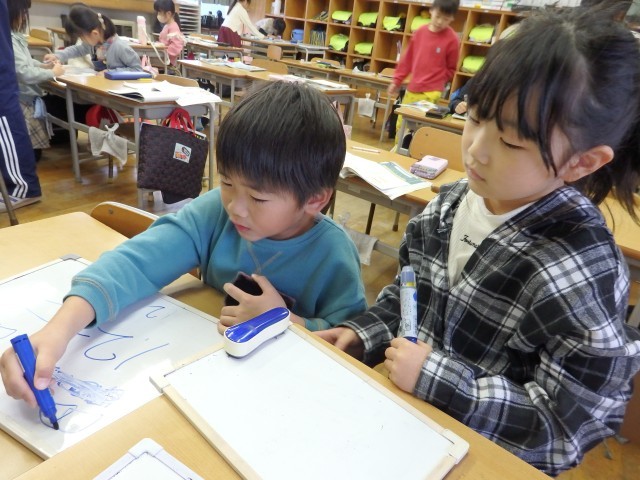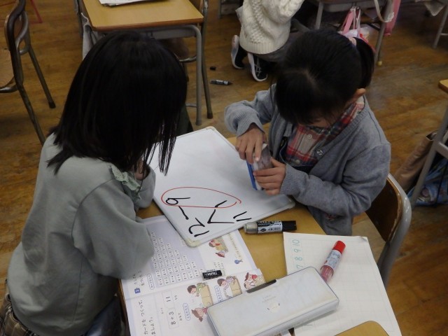1年生の1時間目は算数の授業でした。「タマゴが3個入っているパックと9個入っているパックがあります。タマゴは合わせて何個ですか」という問題に取り組んでいました。子どもたちはすぐに足し算ということが分かり、3+9という式もできました。そして「3+9」をどうやって計算するかを考えました。「さくらんぼ算でやっていい?」と早く解きたくてウズウズしている子どもたち。1人で考えたい子は1人で、協力して考えたい子はグループになり、ホワイトボードに式や文を書きながらやり方を考えました。