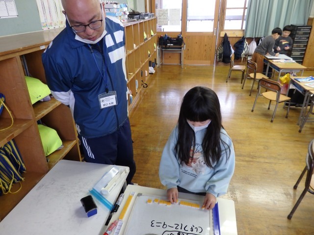 1年生の3時間目は算数の授業でした。市学習指導センターの指導主事や他校の先生、校内の先生たちとたくさんの人が参観しての授業です。「ケーキが12個ありました。そのうち9個食べました。残りは何個ですか」という問題に取り組みました。隣の人と話し合ったりしながら、問題文から分かることを発表していきました。「9個食べてなくなったから引き算」「残りはとあるから引き算」という意見が出たところで、12-9の計算の仕方を考えました。ホワイトボード、ブロックなどを使って、1人で考えたい人は1人で、友だちと考えたい人は協力して考えました。