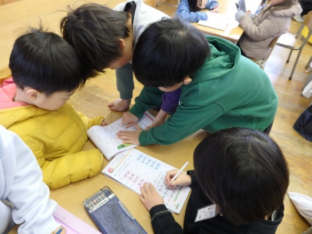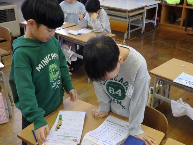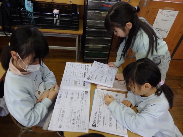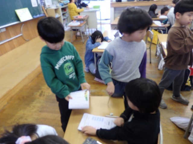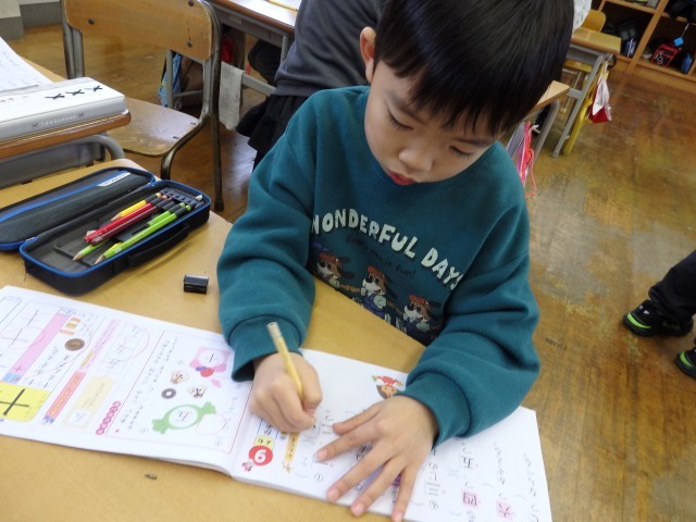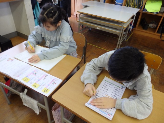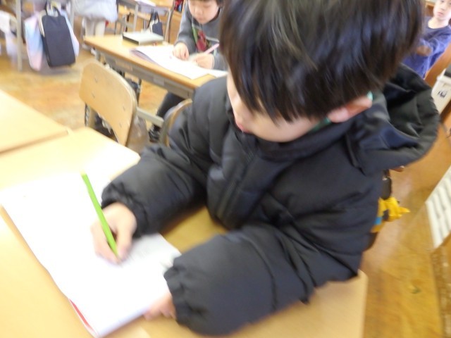 1年生の2時間目です。1月の家庭学習の計画を立てていました。ロッカーや引き出しの中にある漢字や計算のドリルなどを見ながら、毎日10分間の家庭学習で何をするか考えていました。学習でも1年のまとめとなる3学期です。授業では24人みんなで助け合いながら学習し、家に帰ってからは1人でしっかりと復習をして、1年生の内容を身に付けてほしいです。