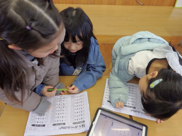 1年生の3時間目は算数の授業でした。12-6や11-3にような2けたと1けたの引き算の学習です。まずは、隣の人と話し合ったり確かめ合ったりしながら「さくらんぼ算」の大事なポイントを確認しました。全員やり方が分かったと手をあげたところで教科書の問題に取り組みました。自分でノートに問題を解いて書いていく人、友だちと話し合いながら解いていく人、ホワイトボードにやり方を書いて確認しながら取り組み人など、【全員が分かって説明もできる】ことをめあてに頑張っていました。