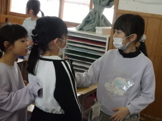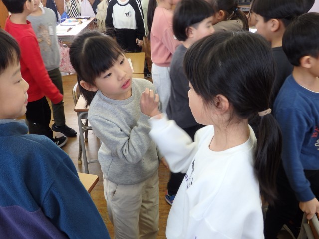 1年生の4時間目は生活の授業でした。黒板に「いじめゼロ」のためにみんなで決めたスローガン「みんなで助け合って、人に優しくして、成長しよう」が貼られていました。隣の人とペアで「いいところさがし」をしていました。相手の人のいいところを5つ伝えてあげるという活動です。指を折って数えながら伝えていて、いいところを伝えてもらった子もうれしそうな笑顔ですね。5個以上伝えられたという子がたくさんいました。多い子は10個も伝えることができました。