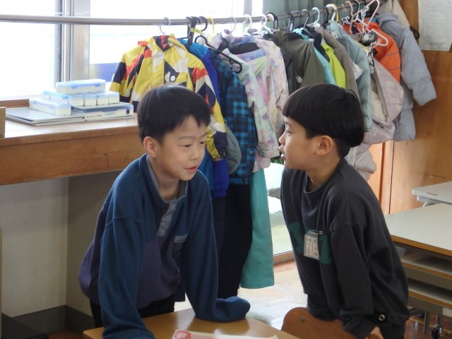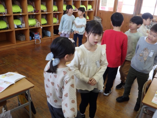 1年生の1時間目は道徳の授業でした。「ぼくにもあるかな」という資料を読んで「自分や周りの人のよいところを見つけることの大切さ」について考えました。「主人公のちゅうたは、帰り道に元気にあいさつをするちょろすけ君や重そうな荷物を持っているおばさんの荷物を持ってあげたはつかさんを見て、元気がなくなってきました・・・」という資料です。なぜ、ちゅうたは元気がなくなってきたのかを考えました。そして、最後に先生から「おとなりさんのいいところを見つけよう」と話がありました。するとさっそく手が挙がり、隣の人のいいところを発表してくれた子がいました。他の子たちからも「いいところ」の発表を聞いて、自然に拍手が沸き起こりました。いいですね。