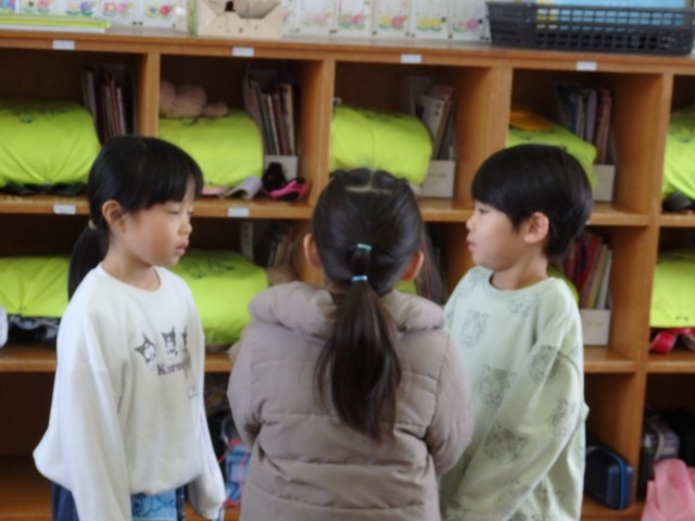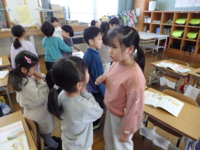 1年生の2時間目は生活の授業でした。先月収穫して保管していたサツマイモをみんなで分け合いました。全員に2個ずつ行き渡ったところで、3個目をゲットする順番決めのジャンケン。勝った人から順番に3個目を慎重に選んで袋に入れていきました。うれしそうに袋の中のサツマイモを見せてくれました。