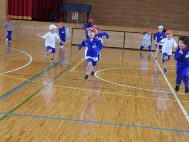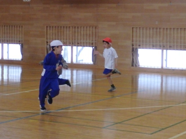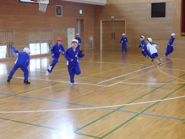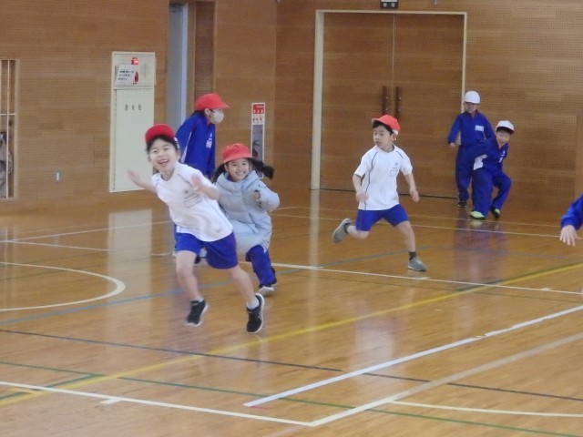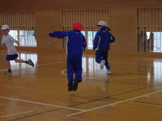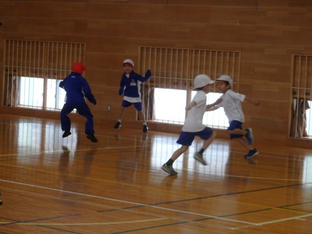 1年生の3時間目は体育の授業でした。まずはウォーミングアップでオニごっこです。オニをやりたい子がたくさんいたのでジャンケンでオニを決めました。「増えオニ」です。全員がオニになるまで走りまくりました。
