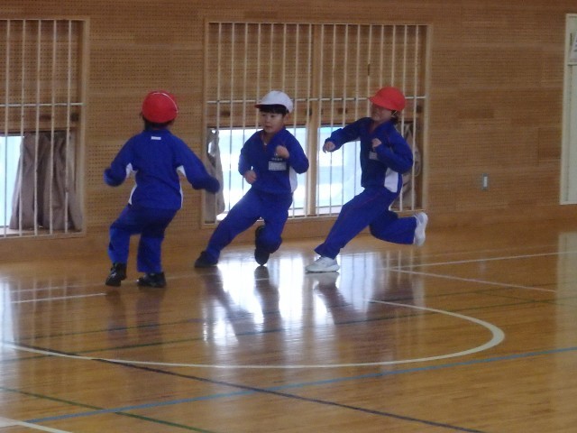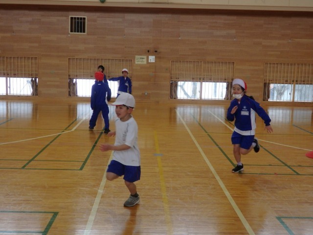 1年生の1時間目は体育の授業でした。まずはウォーミングアップでオニごっこです。オニをやりたいと言う子がたくさんいましたので、ジャンケンでオニを決めました。ハァハァと息を切らしながらも楽しそうに走り回っていました。さらに体を温めるために集合してから、体育館の端にタッチして集合し直すこともして準備万端です。