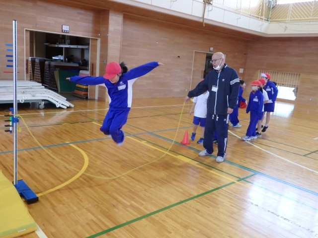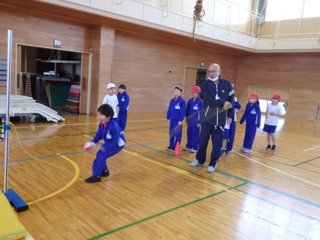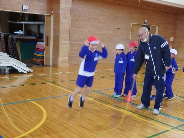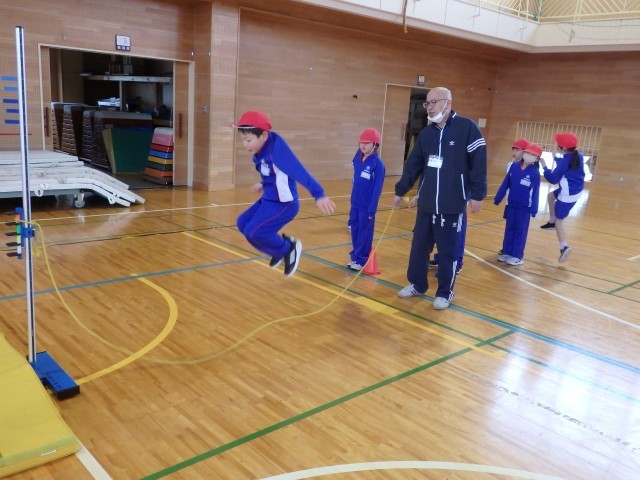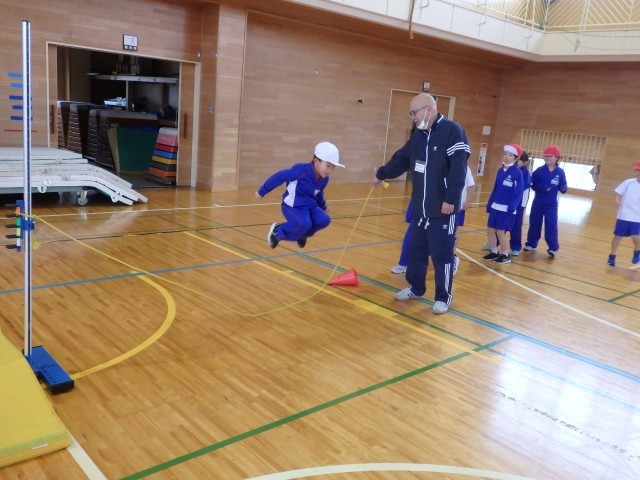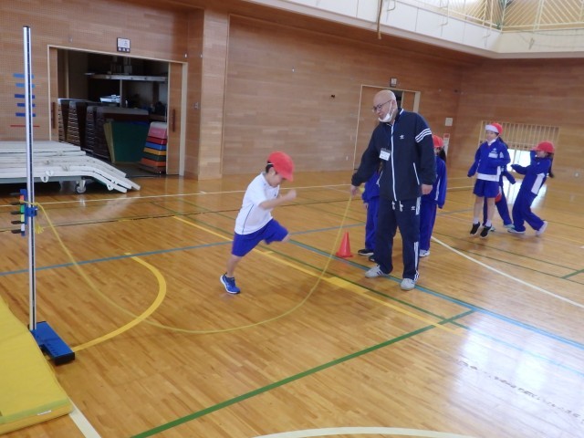 1年生の体育の続きです。ウォーミングアップが終わったら、今日から縄跳びの学習です。初めての縄跳びですので、縄の長さを確認したり、片手で持ってまっすぐ前に回す練習から行いました。しばらく1人1人で跳ぶ練習をした後、2人ペアになって「1分間に合計何回跳べるか」を挑戦しました。初めての子はなかなか難しかったようですが、慣れている子は70回、90回と跳んでいる子がいました。