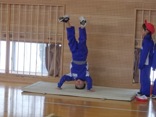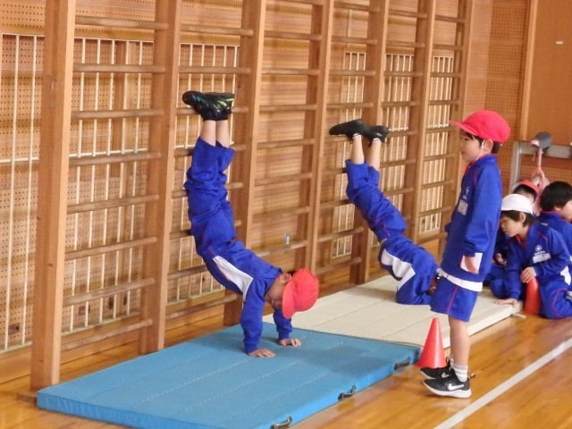 1年生の3時間目は体育の授業でした。マット運動の学習です。前回りや後ろ回り、倒立の練習をしていました。中には側転が上手にできている子がいました。最後に先生の周りに集まって「できるようになった技を披露してくれる人?」と聞くとたくさんの手が。30秒も倒立刷るのを披露してくれた子がいました。