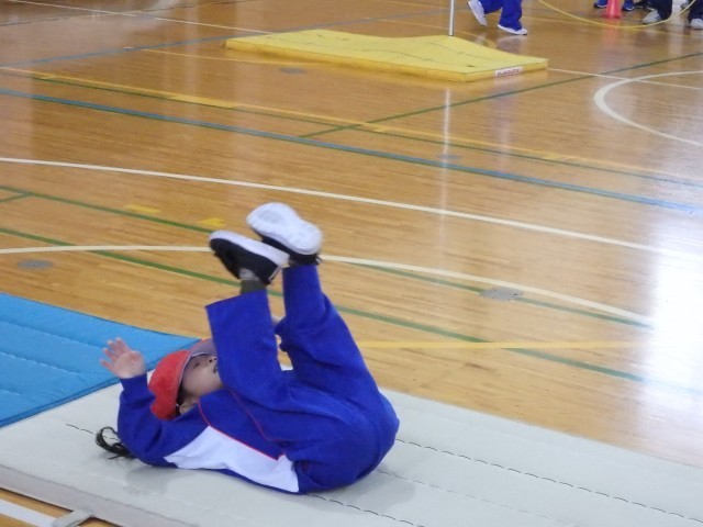 1年生の体育の授業。体が温まったところで、マット運動と縄跳びをしました。倒立、前回り・後ろ回り、縄跳びの3つに分かれて練習をしました。縄跳びは「大波小波」で3回跳んだら次の人に交代です。