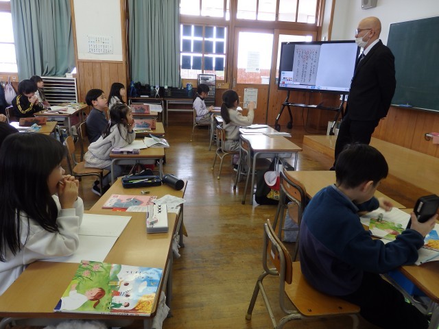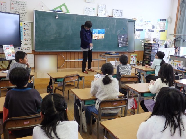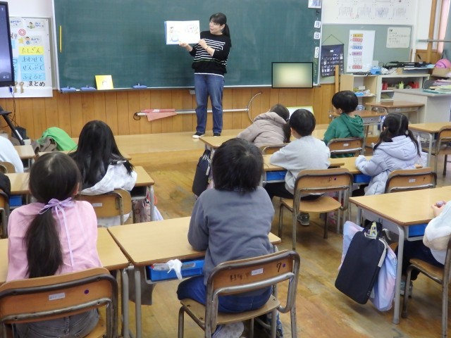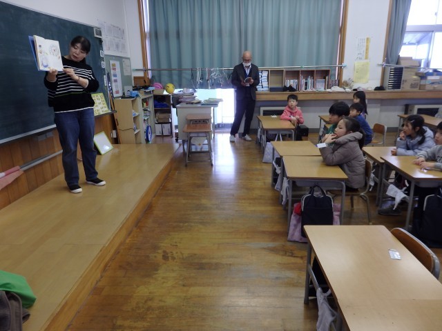 1,2年生の朝の読み聞かせです。みんな、じーっと食い入るように絵本を見てお話を聞いていました。