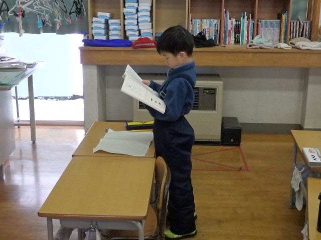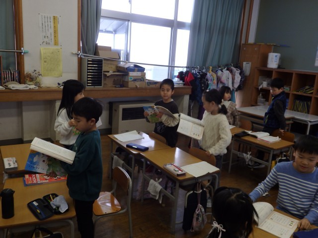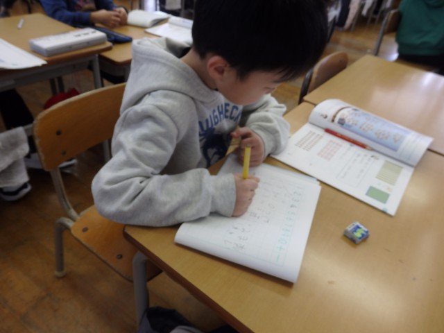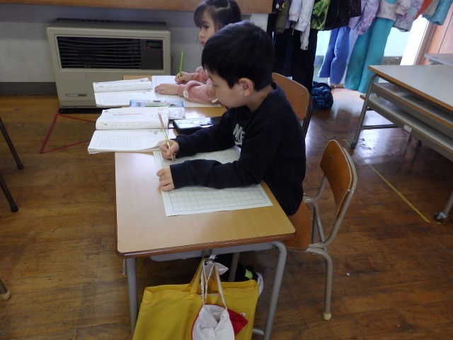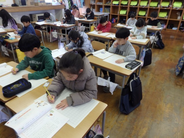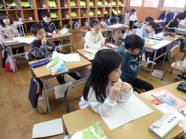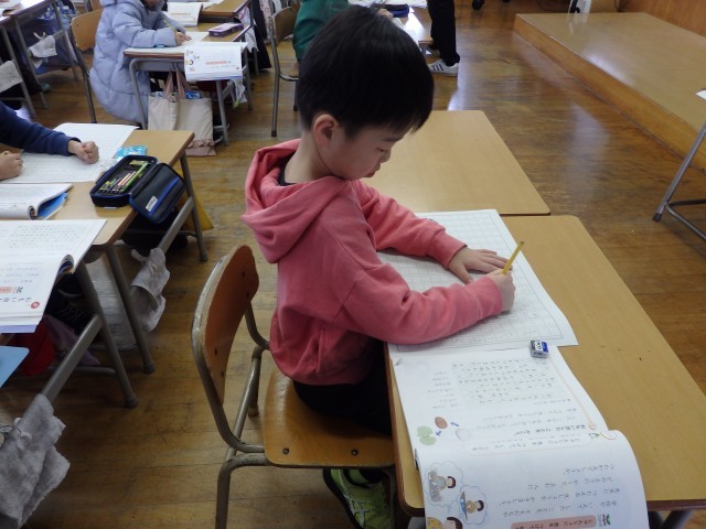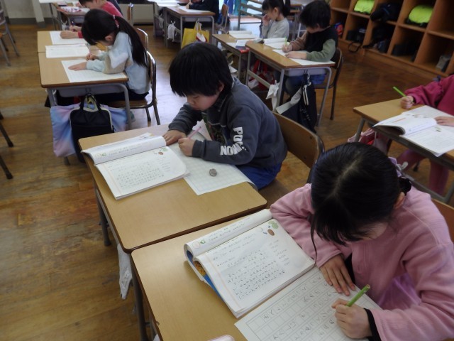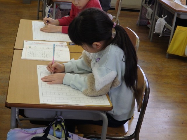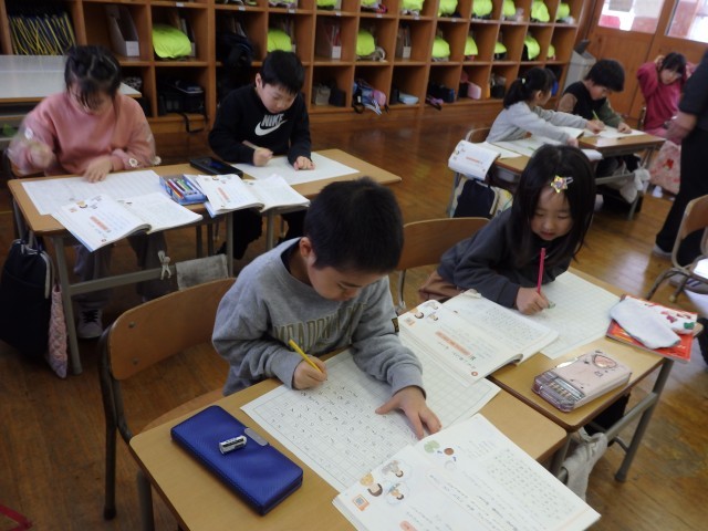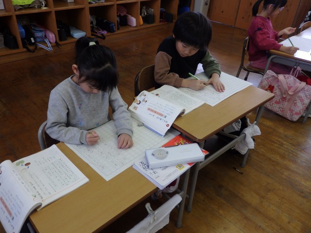 1年生の2時間目です。1月の家庭学習の計画を立てていました。ロッカーや引き出しの中にある漢字や計算のドリルなどを見ながら、毎日10分間の家庭学習で何をするか考えていました。学習でも1年のまとめとなる3学期です。授業では24人みんなで助け合いながら学習し、家に帰ってからは1人でしっかりと復習をして、1年生の内容を身に付けてほしいです。