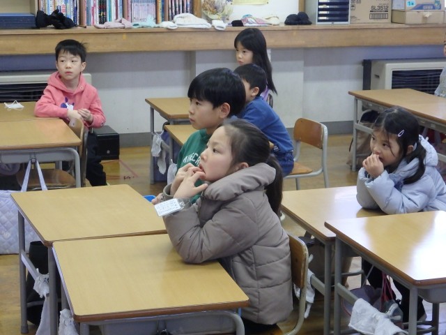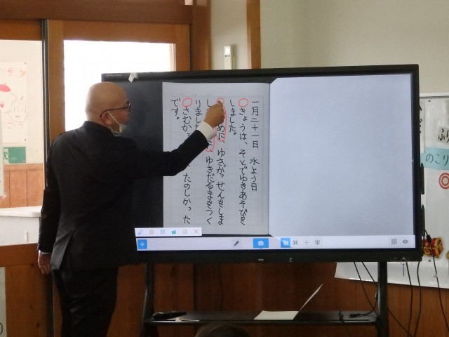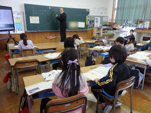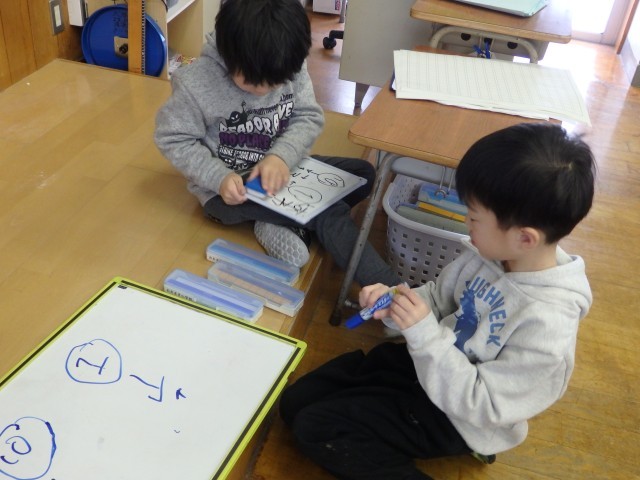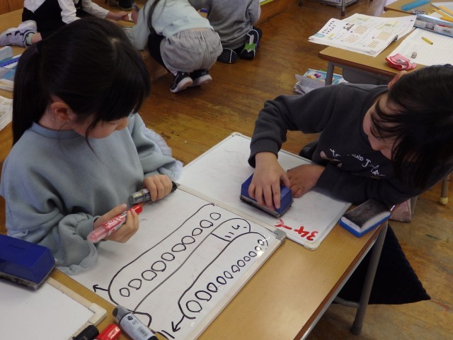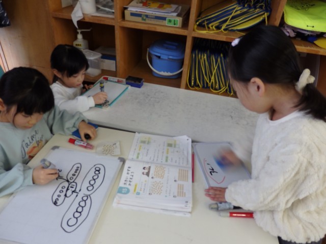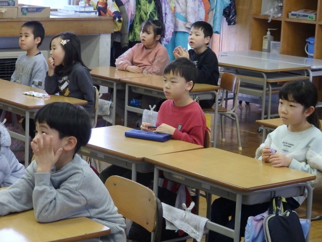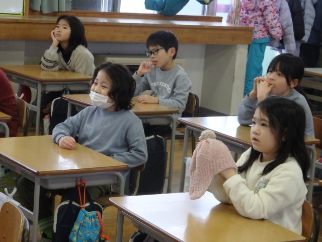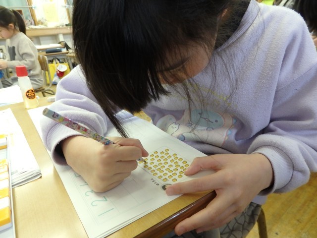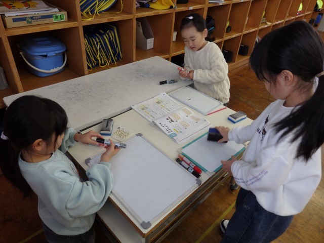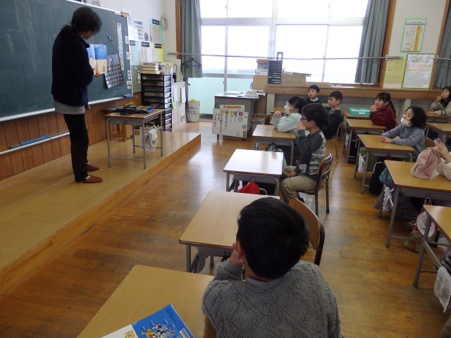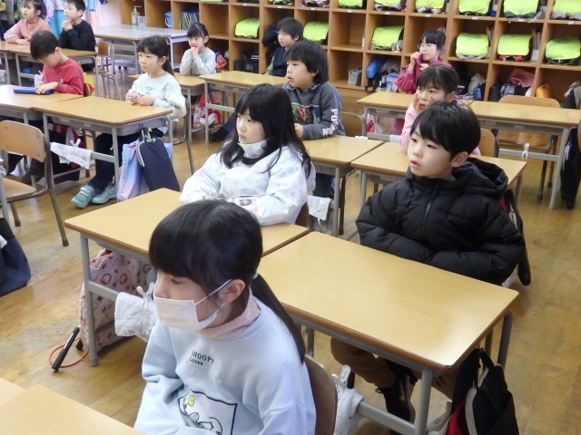 1年生の2時間目です。1月の家庭学習の計画を立てていました。ロッカーや引き出しの中にある漢字や計算のドリルなどを見ながら、毎日10分間の家庭学習で何をするか考えていました。学習でも1年のまとめとなる3学期です。授業では24人みんなで助け合いながら学習し、家に帰ってからは1人でしっかりと復習をして、1年生の内容を身に付けてほしいです。