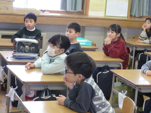 1年生の2時間目は国語の授業でした。「いろいろなふね」の学習です。「客船」について説明する文を読んで、その「役目」、「船にあるもの」、「つくり」について書かれている文はどこにあるのか考えました。問われていることがどこに書かれているのか見つけ出すことが正しく読みとる力になります。隣の人と話し合ったり確かめ合ったりしながら、一生懸命考えていました。