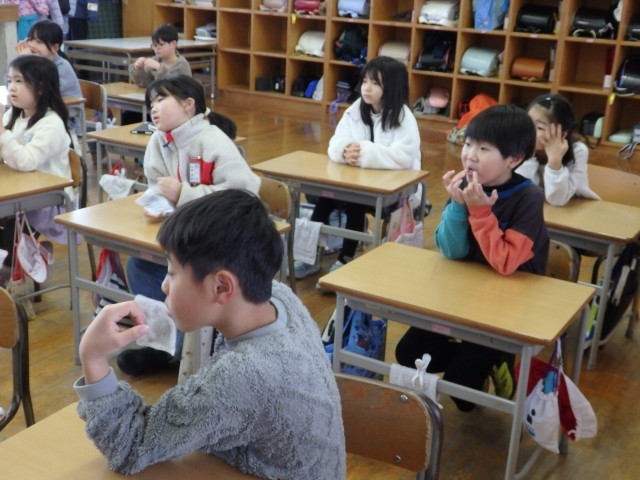 1年生の生活の授業での茶巾絞りづくり。牛乳を混ぜたら味見をしてみます。よほどおいしかったのか、「それ味見?」というくらい何度もパクッとしている子がいました。なぜか食べる大きさもだんだん大きくなっているような・・・。