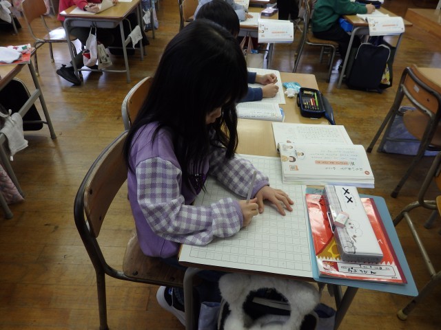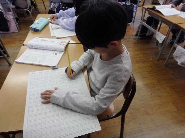 1年生の2時間目は国語の授業でした。「思い出して書こう」の学習です。教科書の文を参考にして、原稿用紙に自分の体験したことを思い出して書きました。「ディズニーシーに行ったこと」「沖縄に行ったこと」「スキーに行ったこと」「ぬいぐるみを作ったこと」「犬を買ったこと」などの思い出を書いていました。書く姿勢がとてもいい子がたくさんいました。