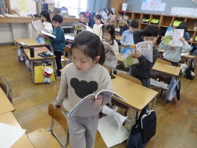 1年生の3時間目は読書の時間でした。好きな本を読んだり、友だちと一緒に読んだりしていました。「これ、小さいときに好きで読んでいた本だよ」と教えてくれた子がいました。中には、絵本ではなく字がいっぱいの本を読んでいる子がいました。
