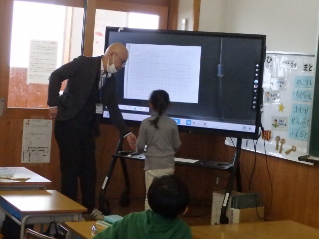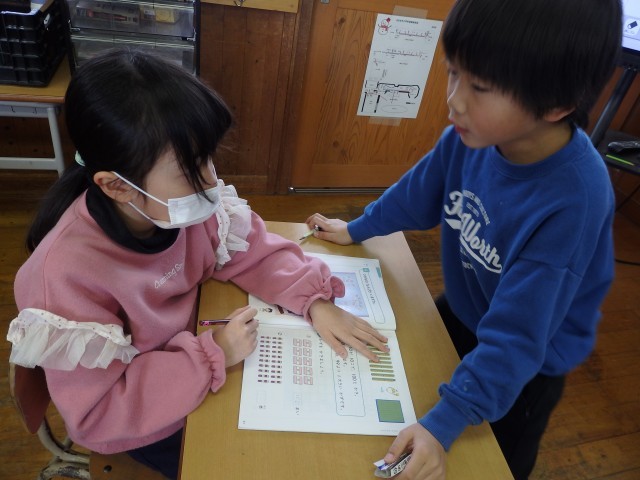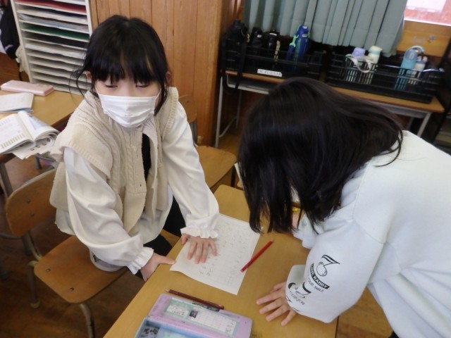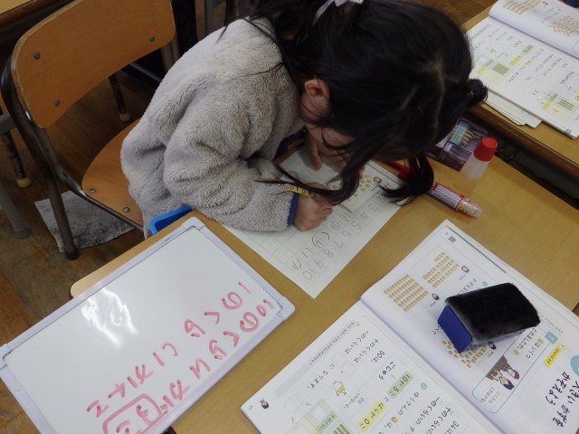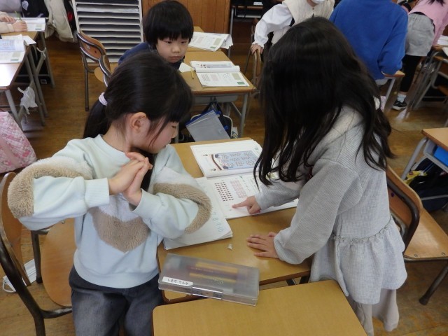 1年生の5時間目は国語や算数のドリルに取り組んでいました。友だち同士で教え合いながら取り組んでいました。「ねぇ、教えて」という声がたくさん聞こえてきました。和気あいあいとした雰囲気で、子どもたちも笑顔で学習を進めていました。