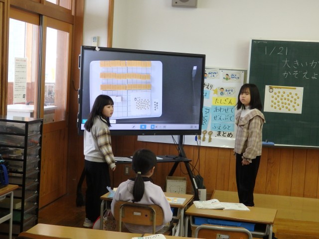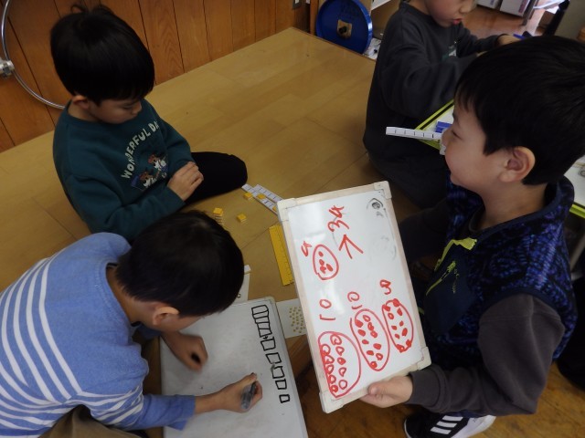 1年生の4時間目は算数の授業でした。「大きい数」の学習です。34という数字の一の位と十の位は何か考えました。ブロックを使ったり、ことばで説明を書いたりして考えました。「一の位は1が何個あるか、十の位は10が何個あるかの数」とポイントをホワイトボードに書いていたので、先生が電子黒板に写し、みんなでノートに書きました。