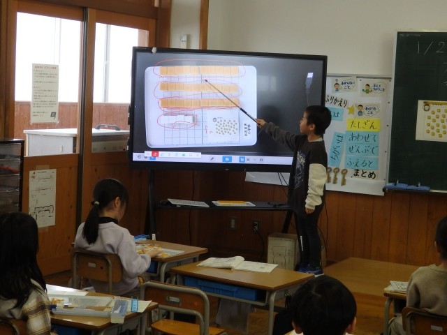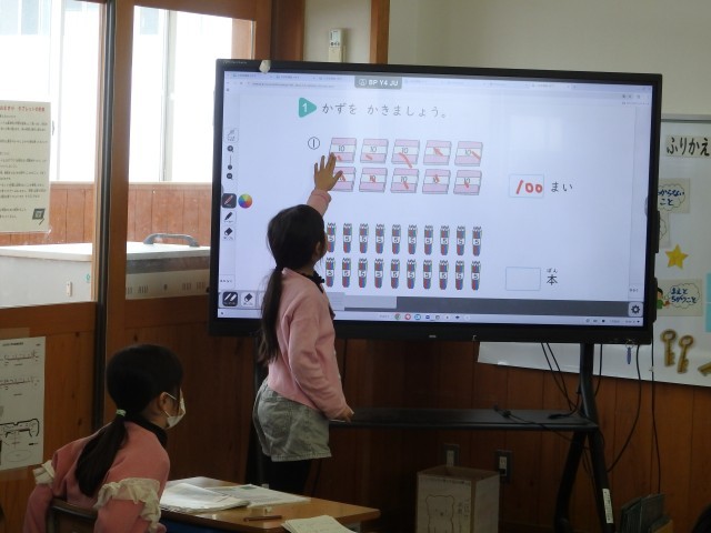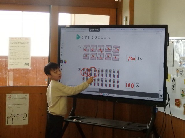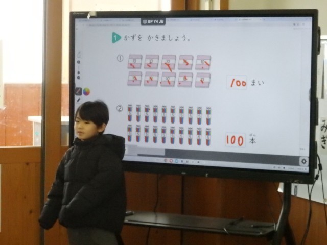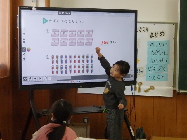 1年生の2時間目は算数の授業でした。「10のまとまりが10個で100になる」ことを学びました。10冊ずつまとまっているノート10束や5本ずつまとまっている鉛筆20束が何本かを求める問題に取り組んでいました。全員が解けるように教え合いました。電子黒板に答えを書き込み、違う子がどうやって数えるのかみんなに説明しました。分かりやすくみんなに説明することができました。