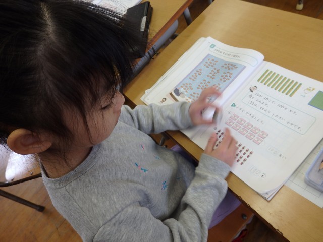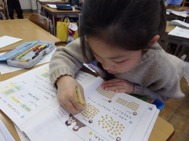 1年生の2時間目は算数の授業でした。他校の先生や市の指導主事が参観しての授業です。「大きい数」の学習です。たくさんのブロックがバラバラに置かれている絵をチラッと見せて「何個あるか分かった?」とたずねる先生。すぐにその絵が載っている教科書のページを開き、数え始める子どもたち。すると先生から「数えやすくするにはどうしたらいいかな?」と質問が。ホワイトボードとブロックを使ったり、絵に書き込んだりして、どうやったら数えやすくなるのか考えました。10個ずつのまとまりを作ればいいことが分かったところで、もっとたくさんのブロックがある絵が配られ、何個なのか数えていきました。今度は絵に描かれているブロックを10個ずつ○で囲って数えている子がいました。