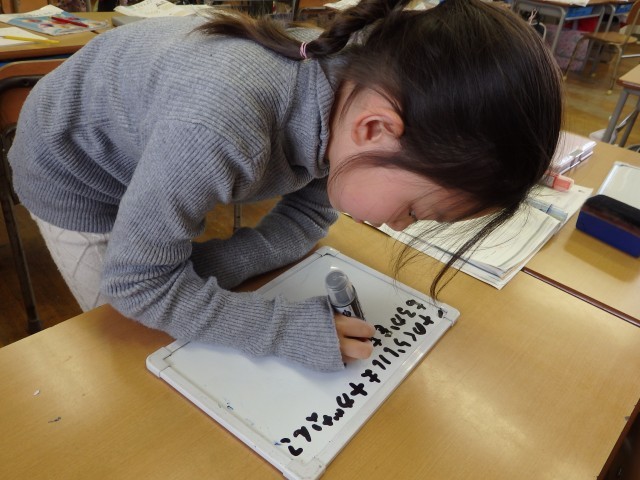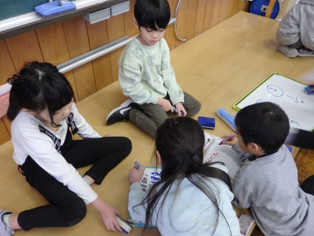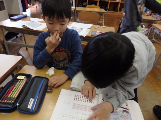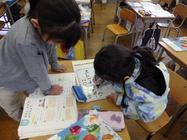 1年生の5時間目は算数の授業でした。ドリル教材の「スイッチオンさんすう」を進めていました。分からない問題があると「ねえ、教えて」と友だちに声を掛け、声を掛けられた子も「いいよ。これはね・・・」と答えではなくやり方を教えてあげる姿が見られました。分からないところをそのままにしない、分からないことがあったら「分からない」と言える、教え合ってみんなで成長しようとする姿がとてもいいです。