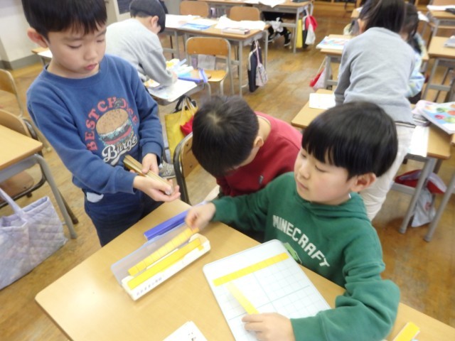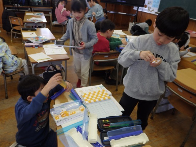 1年生の5時間目は算数の授業でした。「広さ」の学習です。隣の人とペアで陣取りゲームを行っていました。ジャンケンをして勝った人が縦5横5のマス目の中を1マス塗っていきます。ジャンケンを25回戦し終わったときに、どちらの方が広いかを比べます。みんな笑顔でゲームを楽しんでいました。