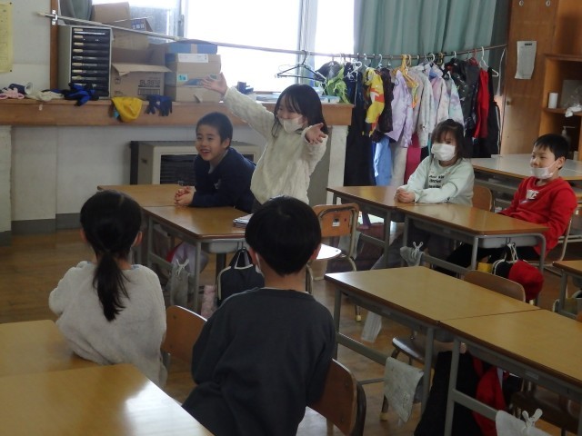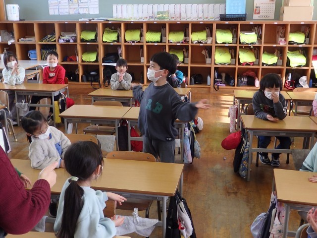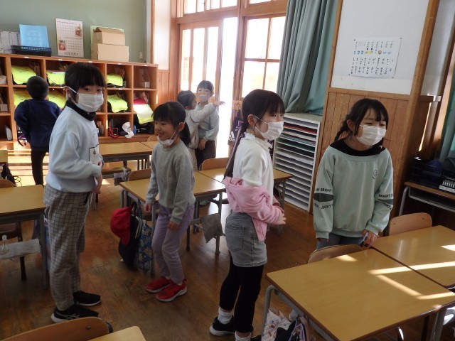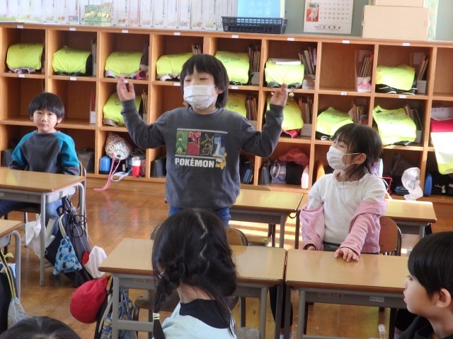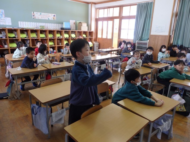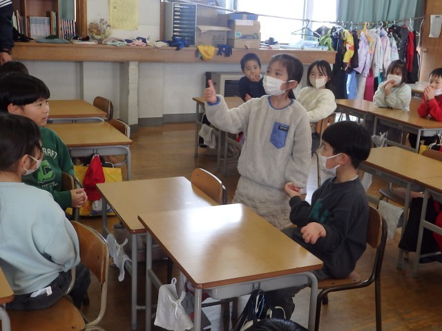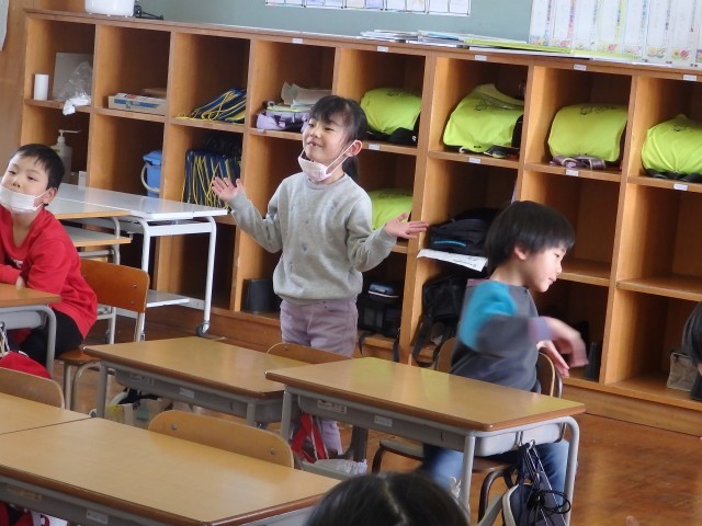 1年生の3時間目です。まずは3学期の学級委員を選びました。「やりたい!」と立候補する人がたくさんいましたので、1人ずつ「学級委員になって頑張ること」を発表していきました。「他の人の勉強が分からないところを教えてあげる」「いけないことをしている人がいたら注意する」など、学級委員として頑張ることを発表してくれました。