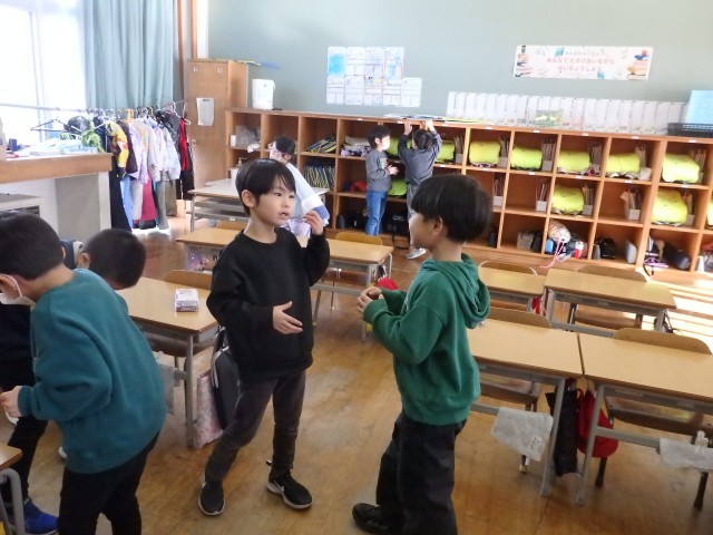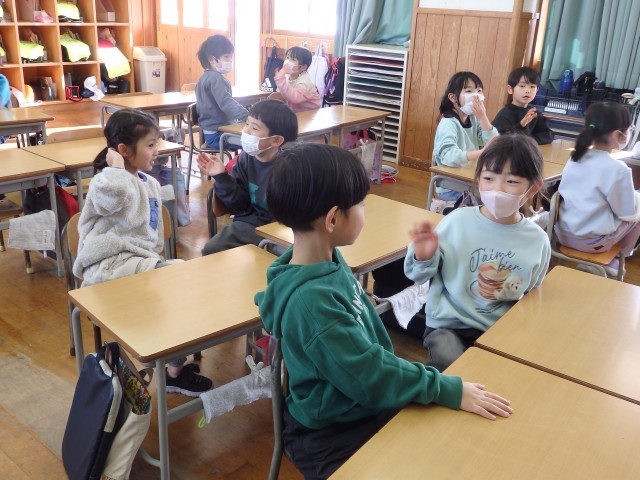 1年生の1時間目は道徳の授業でした。「ぼくにもあるかな」という資料を読んで「自分や周りの人のよいところを見つけることの大切さ」について考えました。「主人公のちゅうたは、帰り道に元気にあいさつをするちょろすけ君や重そうな荷物を持っているおばさんの荷物を持ってあげたはつかさんを見て、元気がなくなってきました・・・」という資料です。なぜ、ちゅうたは元気がなくなってきたのかを考えました。そして、最後に先生から「おとなりさんのいいところを見つけよう」と話がありました。するとさっそく手が挙がり、隣の人のいいところを発表してくれた子がいました。他の子たちからも「いいところ」の発表を聞いて、自然に拍手が沸き起こりました。いいですね。