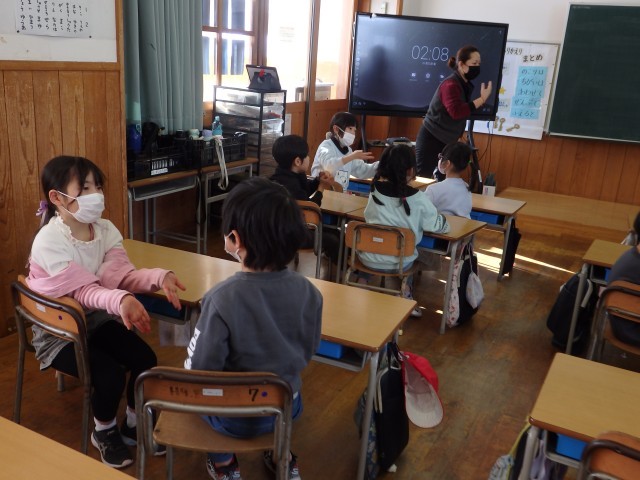1年生の5時間目は国際科の授業でした。まずは「How are you?」「I'm ~.」とやり取りをして気分をたずね合う活動です。1人の子に対してみんなで「How are you?」とたずねていきます。答えるときにジェスチャーをつけて答えることができました。誰かが発表した後に自然とみんなが笑顔で拍手が送っている姿がとてもよかったです。隣の人とも「How are you?」でたずね合いました。後半は、2月2日に行う国際交流会のための練習をしました。交流会では国際大学生といろいろな遊びをしますが、今日はその中の一つ「福笑い」の練習をしました。先生が身をつぶって持っている顔のパーツを「アップ」「ダウン」「レフト」「ライト」で誘導します。ニコニコ笑顔で英語を使った1時間でした。