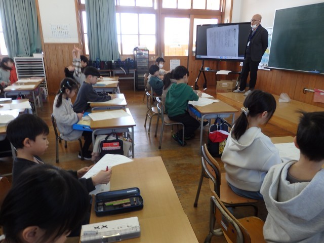 5時間目は学習参観でした。各学年とも人権に関する授業を行いました。1年生は「折れた定規」という資料をもとにして考えました。「じゅんこさんが持っているピカピカの定規がうらやましくて、勝手に触って折ってしまったひろしさん。みちこさんや周りの子たちから責められています」という内容です。自分ならひろしさんに何て声を掛けるか考えました。人の物を勝手にいじることは間違いですが、間違った行動をしてしまった人にどう接するか、よく考える必要がありますね。日常生活でもよくある場面だと思います。