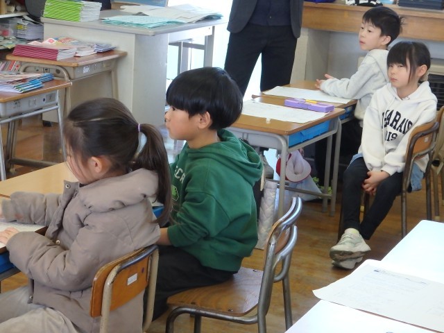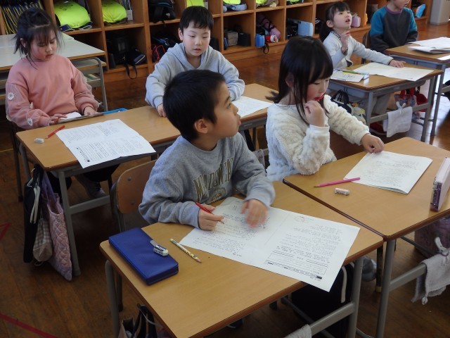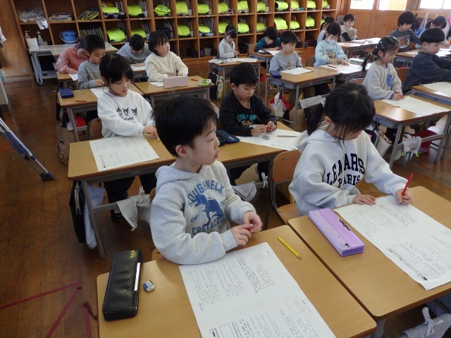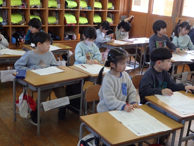 1年生の2時間目です。1月の家庭学習の計画を立てていました。ロッカーや引き出しの中にある漢字や計算のドリルなどを見ながら、毎日10分間の家庭学習で何をするか考えていました。学習でも1年のまとめとなる3学期です。授業では24人みんなで助け合いながら学習し、家に帰ってからは1人でしっかりと復習をして、1年生の内容を身に付けてほしいです。