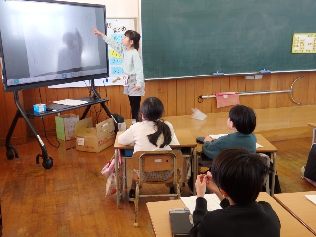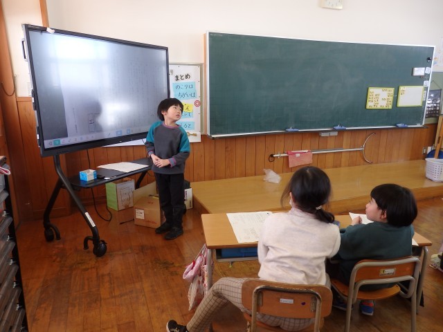 1年生の1時間目は算数の授業でした。「形」の学習です。子どもたちが家から持って来たいろいろな箱を班ごとで集め、同じ形で仲間を作りました。班のみんなで話し合いながら、丸い筒状のもの、細長い四角、平べったい四角、大きい四角などに分けていました。仲間分けが終わったら、どんなふうに分けたのか発表です。先生がiPadで撮影し、オンラインで繋いだ電子黒板に分けた様子を映して、みんなに見せていました。