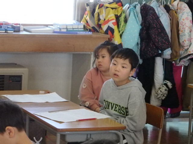 1年生の3時間目は国語の授業でした。昨日に引き続き、1年間の学習のまとめの問題に取り組んでいました。やり終わったら丸付けをしていきますが、なぜその答えになるのかを子どもたちで説明していきました。問題文を指さして「ここにこう書いてあるから・・・」と文の意味を根拠にしてわかりやすく説明することができました。じーっと説明を聞いている姿がいいですね。ウンウンと大きく頷きながら聞いている子がいました。