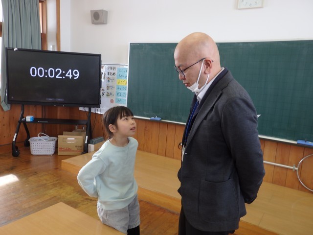 1年生の3時間目は算数の授業でした。これまでに学習した内容のプリントに取り組んでいました。今日は教え合いではなく、自分の力で取り組む時間のようです。やり終わったら先生から丸付けをしてもらい、間違ったところがあったらやり直しをします。集中して頑張っていました。