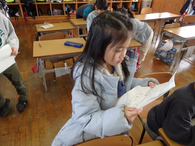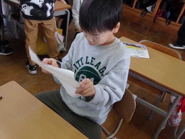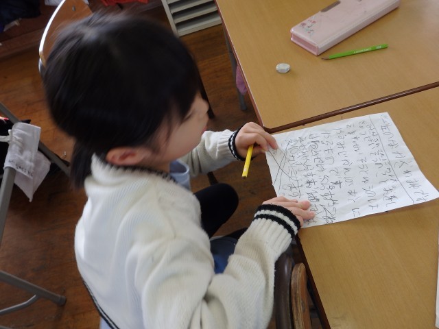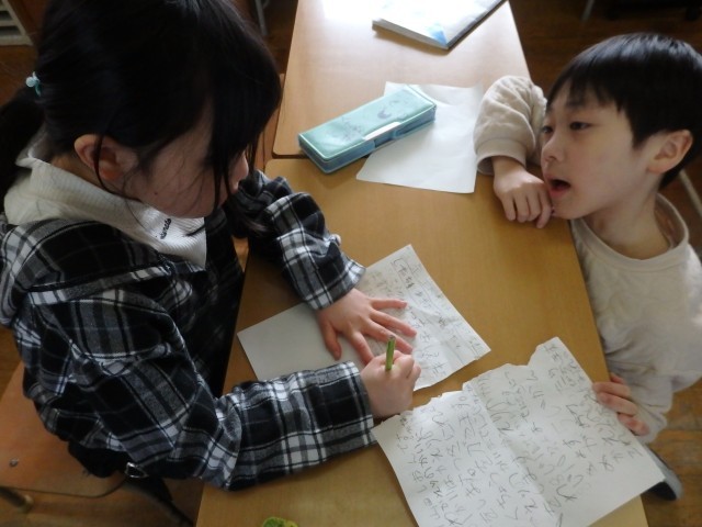 1年生の5時間目は国語の授業でした。17日に行う新入生体験入学の中で、1年生が新1年生に「小学校生活の1日」と「学校行事」について説明します。「小学校生活の1日」では朝の会から始まって、給食や授業、清掃などについてどんなことをするのかを、「学校行事」では入学式、運動会、学習発表会だけでなくアルプの里へ校外学習に行ったことも説明します。自分で説明する内容の文章を考え、なるべく見ないで発表できるように一生懸命練習していました。『お兄さん、お姉さん』のデビューですね。