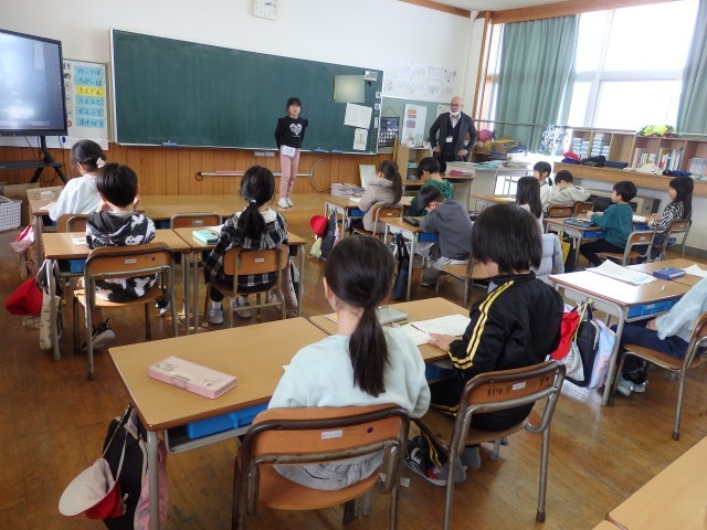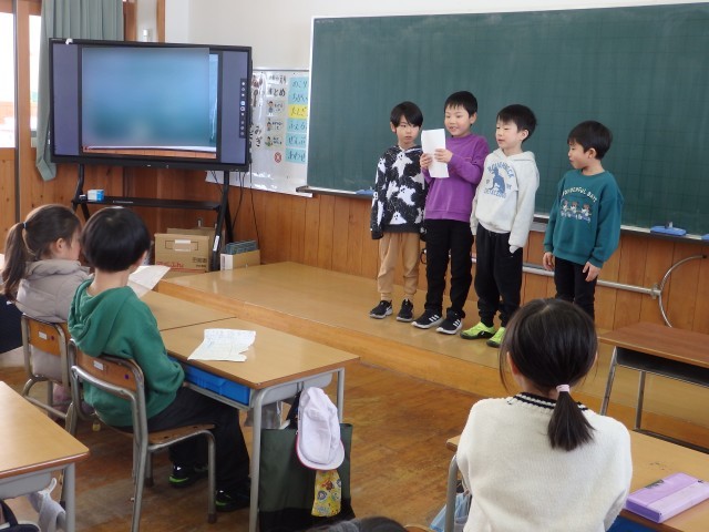 1年生の5時間目の様子です。来週の水曜日に親善スキー大会の激励会が行われますが、その中で各学年から6年生へのメッセージを送る場面があります。メッセージに入れたいことばを出し合い、話し合いってでメッセージを決めました。全部で3つの文ですので、座席の号車ごとで分担しました。みんなでそろえて言うことを意識して、さらに文を覚えて言えるように練習しました。黒板に書かれている文を見ないように目をつぶったり、後ろを向いたりして大きな声で練習しました。