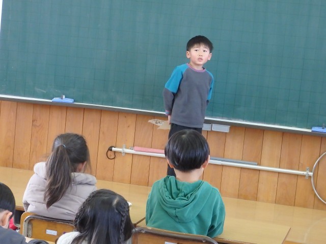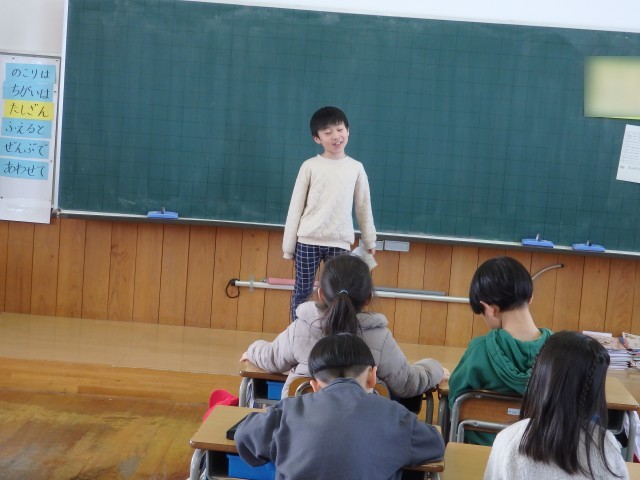 1年生の3時間目です。まずは3学期の学級委員を選びました。「やりたい!」と立候補する人がたくさんいましたので、1人ずつ「学級委員になって頑張ること」を発表していきました。「他の人の勉強が分からないところを教えてあげる」「いけないことをしている人がいたら注意する」など、学級委員として頑張ることを発表してくれました。