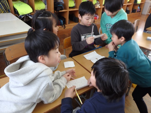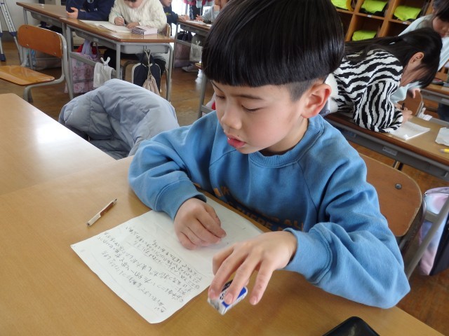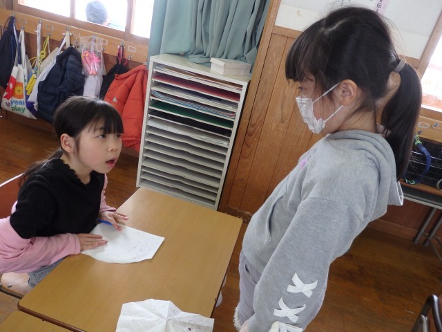 1年生の5時間目は国語の授業でした。17日に行う新入生体験入学の中で、1年生が新1年生に「小学校生活の1日」と「学校行事」について説明します。「小学校生活の1日」では朝の会から始まって、給食や授業、清掃などについてどんなことをするのかを、「学校行事」では入学式、運動会、学習発表会だけでなくアルプの里へ校外学習に行ったことも説明します。自分で説明する内容の文章を考え、なるべく見ないで発表できるように一生懸命練習していました。『お兄さん、お姉さん』のデビューですね。