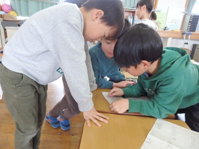 1年生の2時間目です。1月の家庭学習の計画を立てていました。ロッカーや引き出しの中にある漢字や計算のドリルなどを見ながら、毎日10分間の家庭学習で何をするか考えていました。学習でも1年のまとめとなる3学期です。授業では24人みんなで助け合いながら学習し、家に帰ってからは1人でしっかりと復習をして、1年生の内容を身に付けてほしいです。
