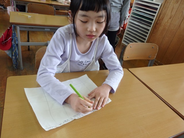 1年生の5時間目は算数の授業でした。「広さ」の学習です。隣の人とペアで陣取りゲームを行っていました。ジャンケンをして勝った人が縦5横5のマス目の中を1マス塗っていきます。ジャンケンを25回戦し終わったときに、どちらの方が広いかを比べます。みんな笑顔でゲームを楽しんでいました。