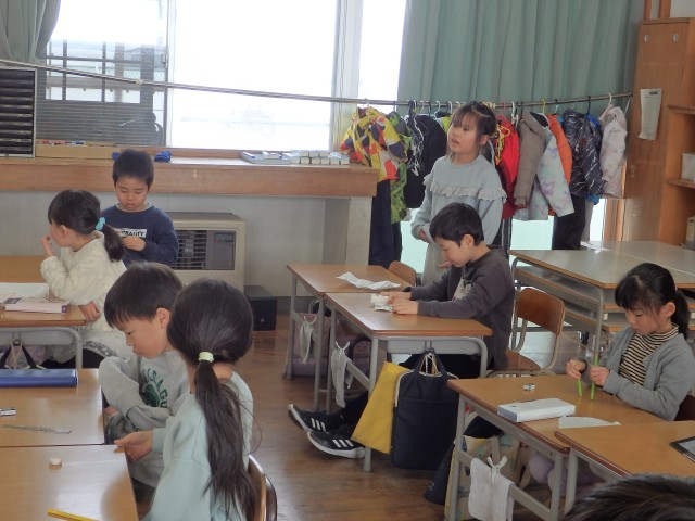 1年生の3時間目です。まずは3学期の学級委員を選びました。「やりたい!」と立候補する人がたくさんいましたので、1人ずつ「学級委員になって頑張ること」を発表していきました。「他の人の勉強が分からないところを教えてあげる」「いけないことをしている人がいたら注意する」など、学級委員として頑張ることを発表してくれました。