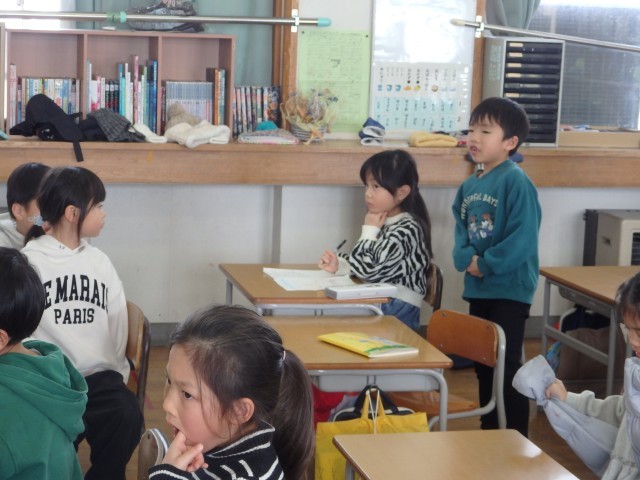 1年生の3時間目は国語の授業でした。昨日に引き続き、1年間の学習のまとめの問題に取り組んでいました。やり終わったら丸付けをしていきますが、なぜその答えになるのかを子どもたちで説明していきました。問題文を指さして「ここにこう書いてあるから・・・」と文の意味を根拠にしてわかりやすく説明することができました。じーっと説明を聞いている姿がいいですね。ウンウンと大きく頷きながら聞いている子がいました。