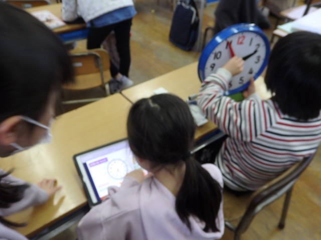 1年生の1時間目は算数の授業でした。時計の読み方の学習です。iPadのドリルパークを使って2人ペアで学習していました。1人の子が時計の針をぐるぐる回して時刻を設定して問題を出します。もう一人の子が時計の針を読んで「○時○分」と数字を入力して回答します。2人で仲良く楽しそうに取り組んでいました。