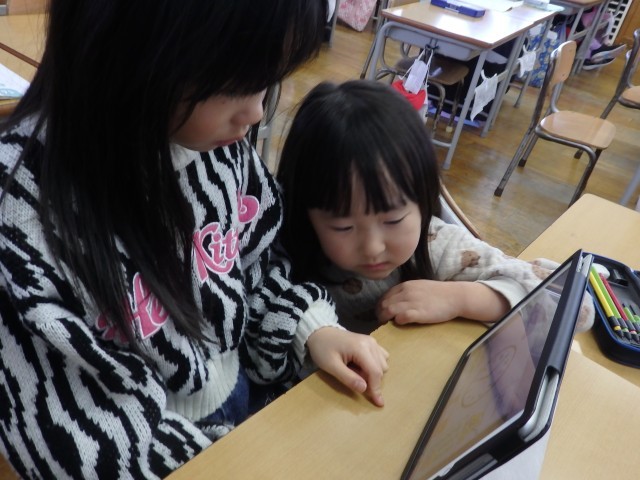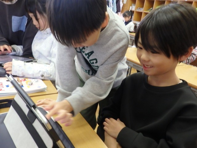 1年生の5時間目は国語や算数のドリルに取り組んでいました。友だち同士で教え合いながら取り組んでいました。「ねぇ、教えて」という声がたくさん聞こえてきました。和気あいあいとした雰囲気で、子どもたちも笑顔で学習を進めていました。