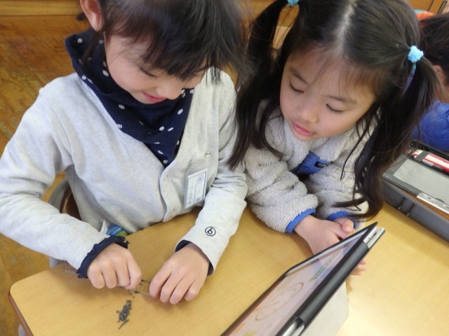 1年生の2時間目は算数の授業でした。「形」についてiPadを使って学習しました。トラックの荷台に乗っている形に合う荷物を当てはめるとトラックが動き出したり、○△□で描かれたロケットでそれぞれの形に指定された色を塗るとロケットが発射されたりするアプリで楽しく学びました。