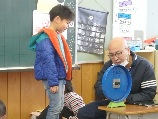 1年生の4時間目は音楽の授業でした。「おちゃらか、ほい」からのスタートです。前回は「おちゃらか、おちゃらか」のところで、手が左右逆になってしまって上手くいかなかったのですが、今日は息ピッタリでうまくできました。笑顔で楽しそうですね。その後、「とんくるりん ぱんくるりん」という歌を歌ったり、鍵盤ハーモニカで演奏したりしました。