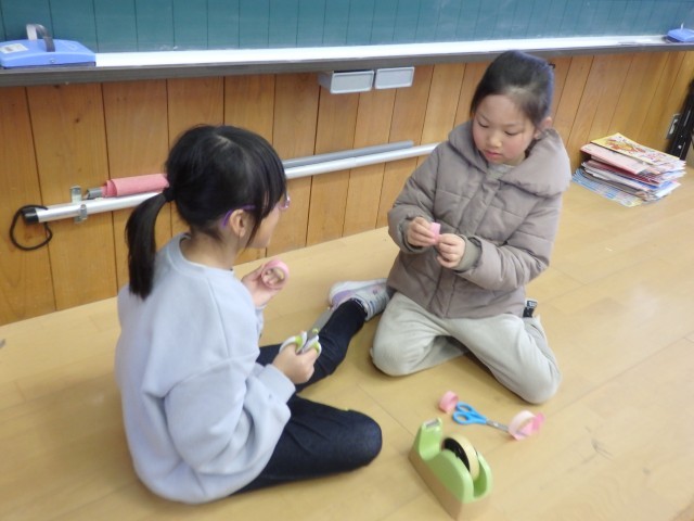 1年生の5時間目の様子です。体験入学でやって来た新入生に学校行事や学校生活について教えてあげました。自分で考えた原稿を覚えて、何も見ずにみんなの方を向いて教えてあげることができました。その後、手を繋いで第2体育館へ行って交流タイムです。けん玉やコマ回しを一緒にやったり、オニごっこで走り回ったりしました。ちょっぴりお兄さん、お姉さんらしくなった1年生でした。