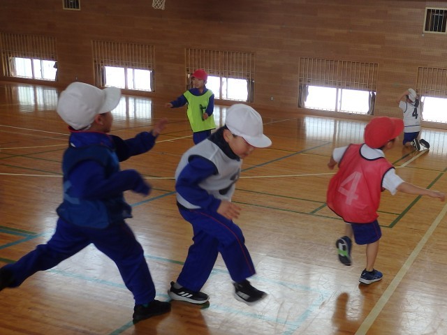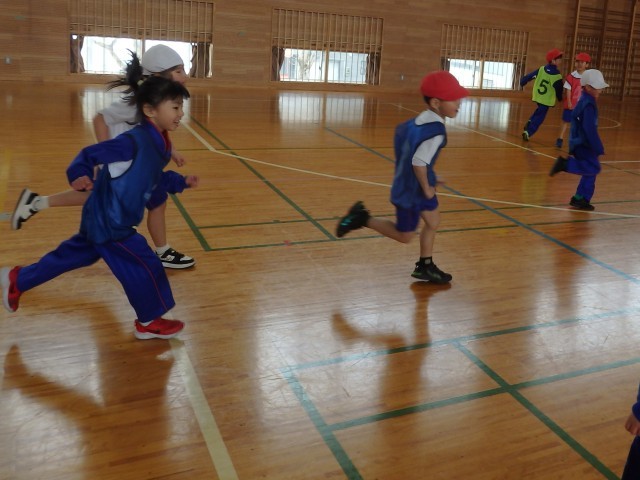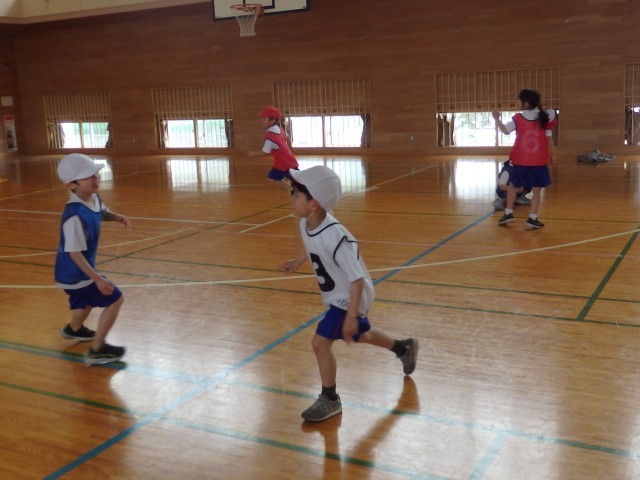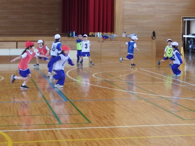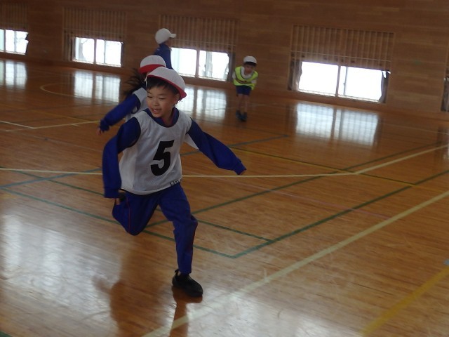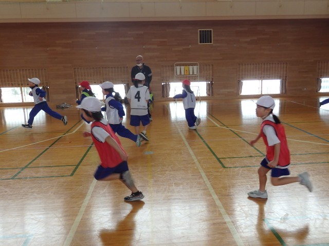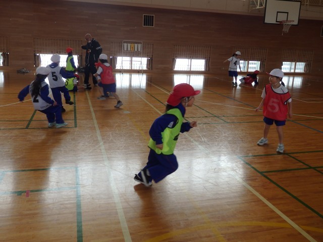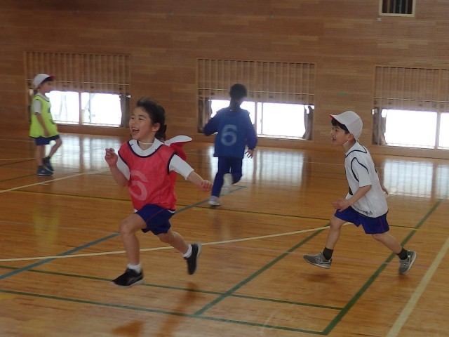 1年生の3時間目は体育の授業でした。まずはウォーミングアップで「オニごっこ」ですが、普通の「オニごっこ」とは違います。1人1人が1~6の数字が書かれたビブを着ています。先生が「3」「2+3」「4-2」のように数字を言うたびに、次々とオニが変わっていきます。ハラハラドキドキのオニごっこで、子どもたちは歓声を上げながら楽しんでいました。