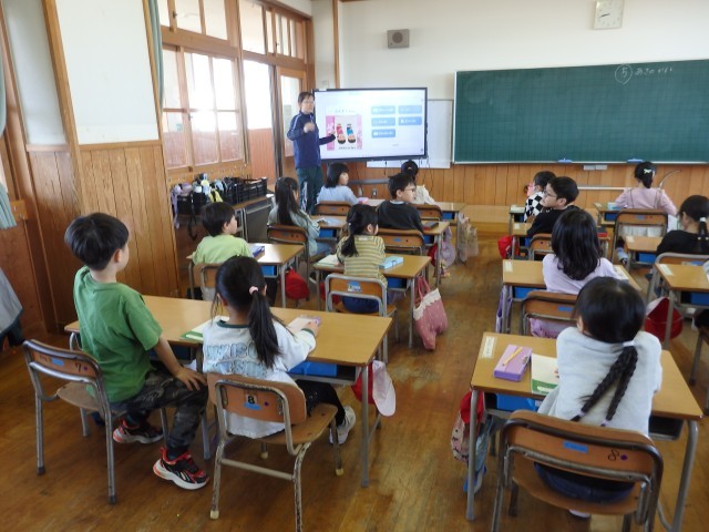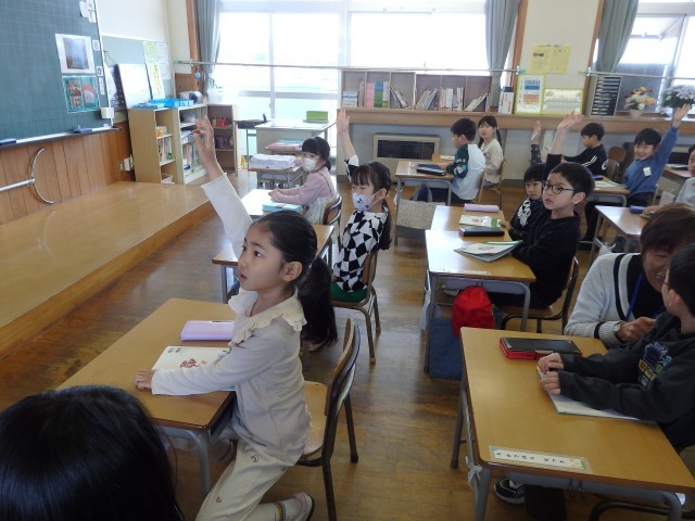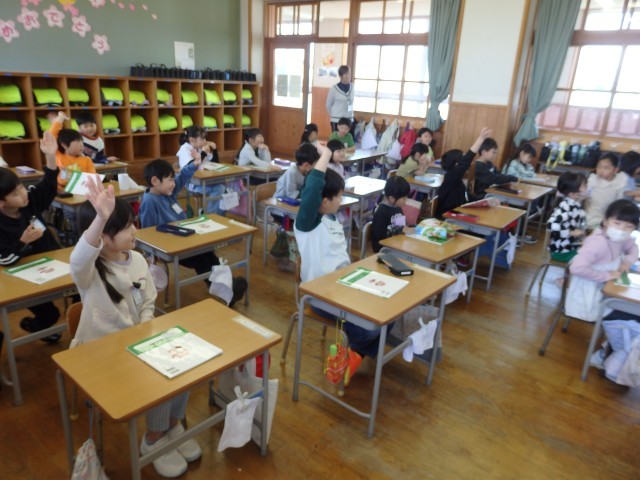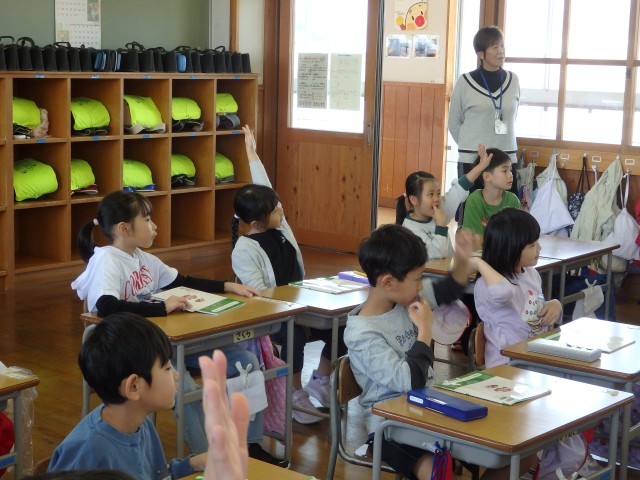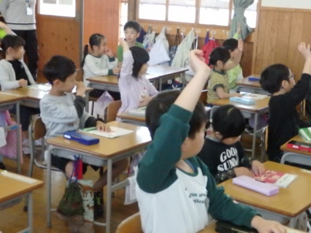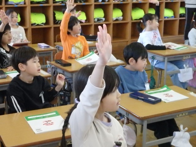 1年生の5時間目は国語の授業でした。「子どもを守る動物たち」の学習です。アリクイについて書かれている段落の内容について先生がクイズ形式で出す問題に答えていました。「アリクイの口の形は?」「アリクイを襲うトラはどうやって子どもを運ぶ?」「アリクイはどうやって運ぶ?」などに教科書を読み返しながら答えていきました。また、教科書のどの文に書かれているかも確かめました。